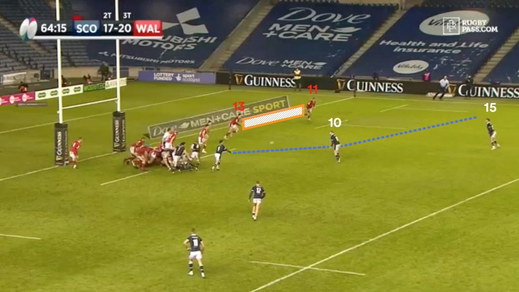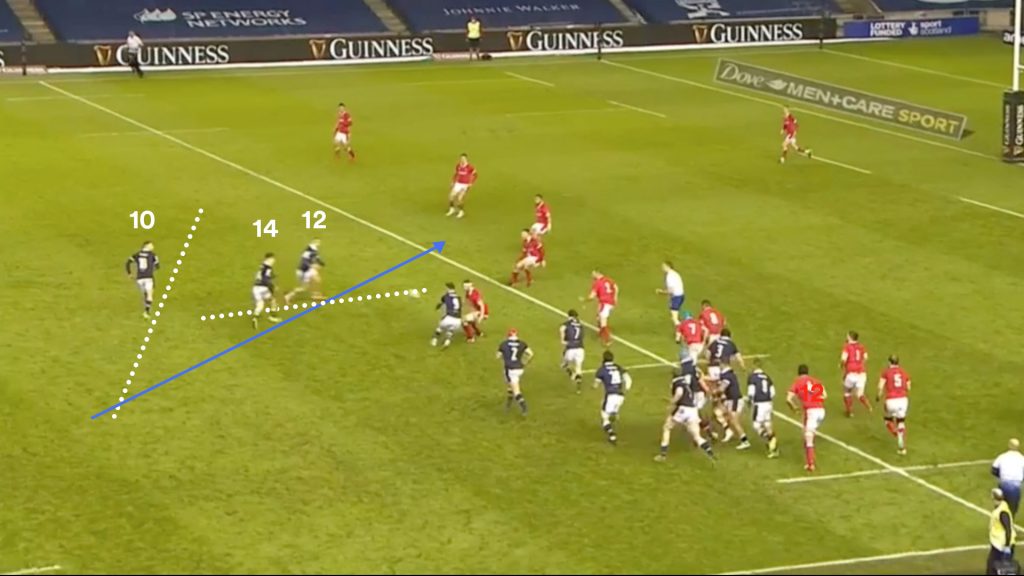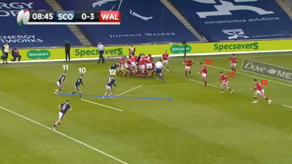Arguably Scotland’s two most dangerous players with ball in hand, Stuart Hogg and Duhan van der Merwe, are waiting out wide looking at a weak edge defence setup.