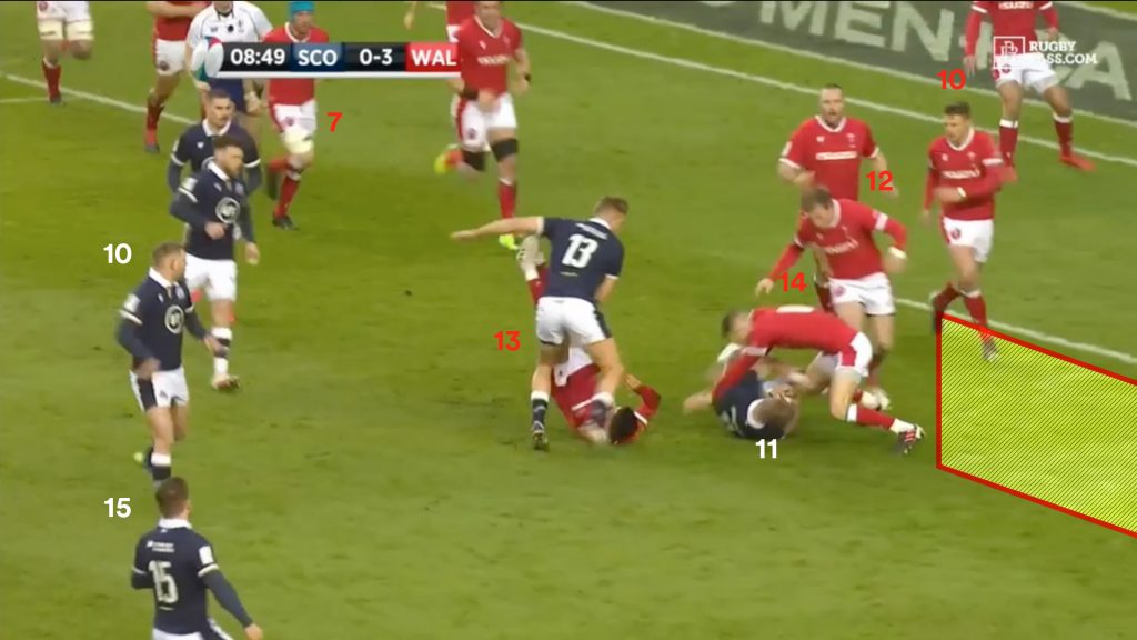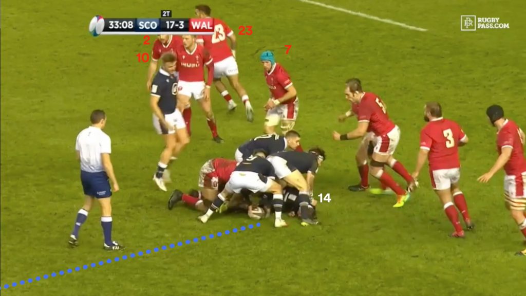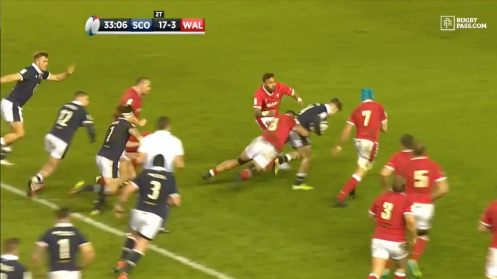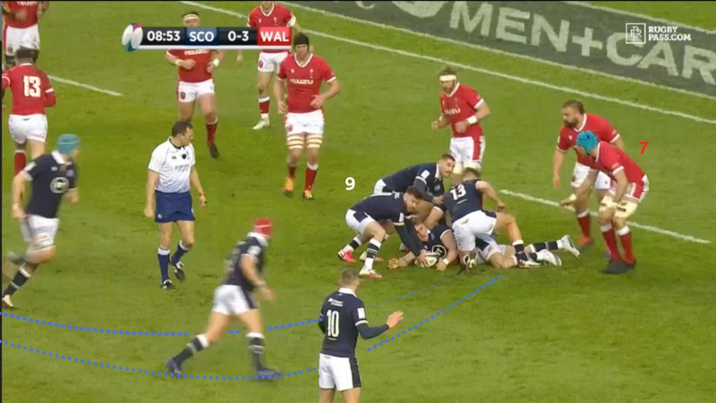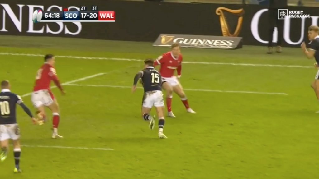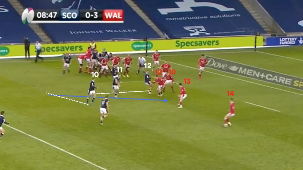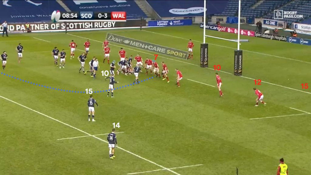 It’s not until the fourth opportunity, with a set-piece scrum inside five metres after multiple penalties, that Scotland attempt to stretch Wales on the first phase.