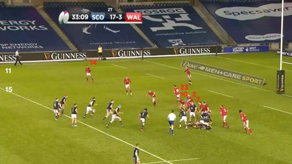 Out wide we see flyhalf Dan Biggar and inside centre Nick Tompkins stationed on Wales’ edge, with fullback Leigh Halfpenny out of picture in the backfield.